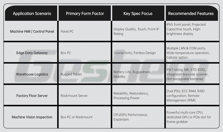 Quick Reference Guide Table for Industrial PC Selection: